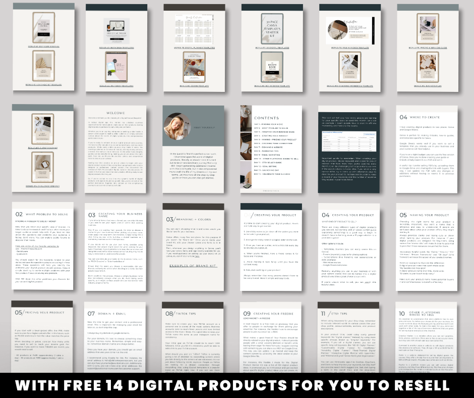 Unlock your digital product business potential with a comprehensive bundle featuring an eBook, 14 resellable digital products, and a 14-day roadmap to success